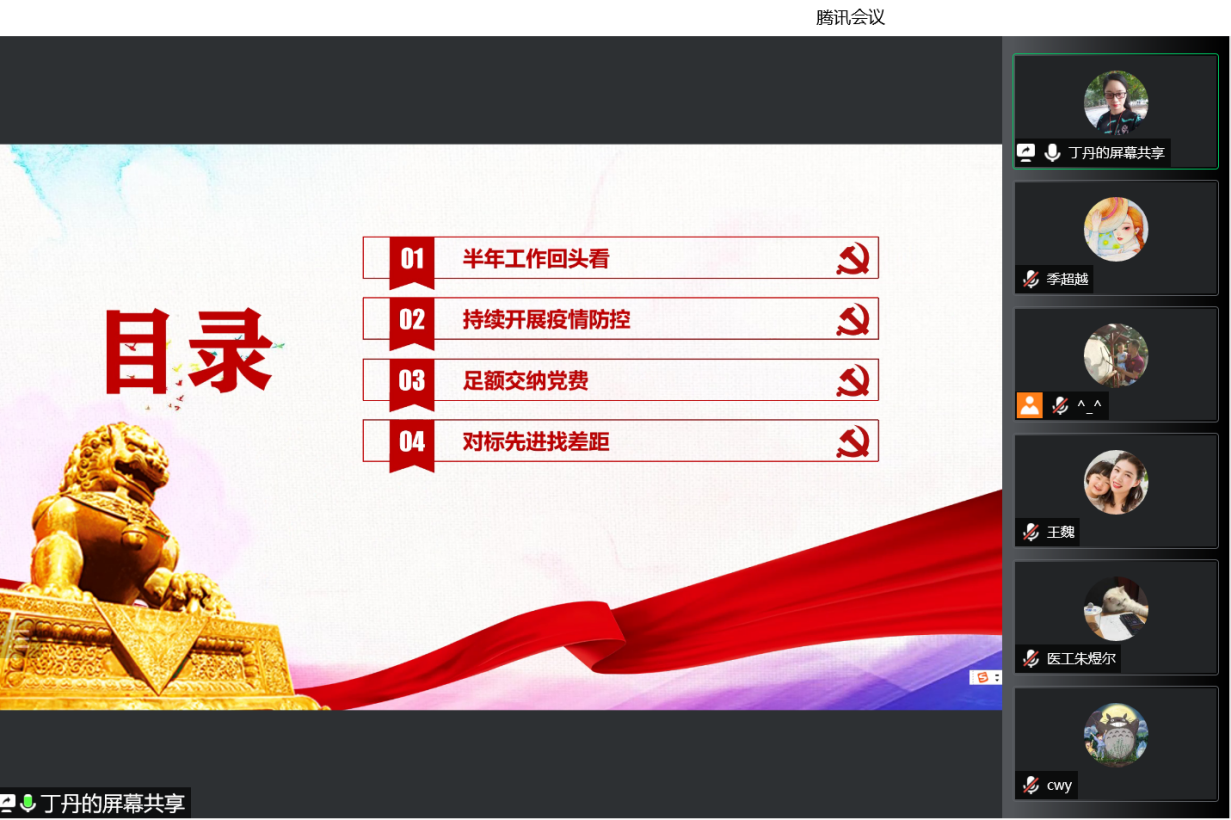 6月17日,智能医学党支部在支部书记丁丹的主持下,借助腾讯会议举行了6月份的主题党日活动。会议以“半年工作’回头看’,对标先进找差距”为主题,通过“半年工作回头看,持续开展疫情防控,足额交纳党费,对标先进找差距”四个方面展开了本次主题党日活动。
