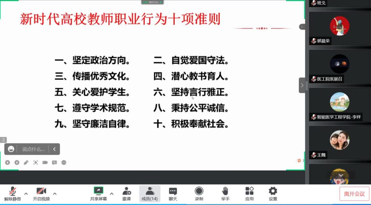 9月7日,智能医学党支部在支部书记丁丹的主持下,借助腾讯会议开展了9月份的主题党日活动。会议以“迎接党的二十大,培根铸魂育新人”为主题,通过“重温《河南教师誓词》,学习《新时代高校教师职业行为十项准则》等方面展开了本次主题党日活动。